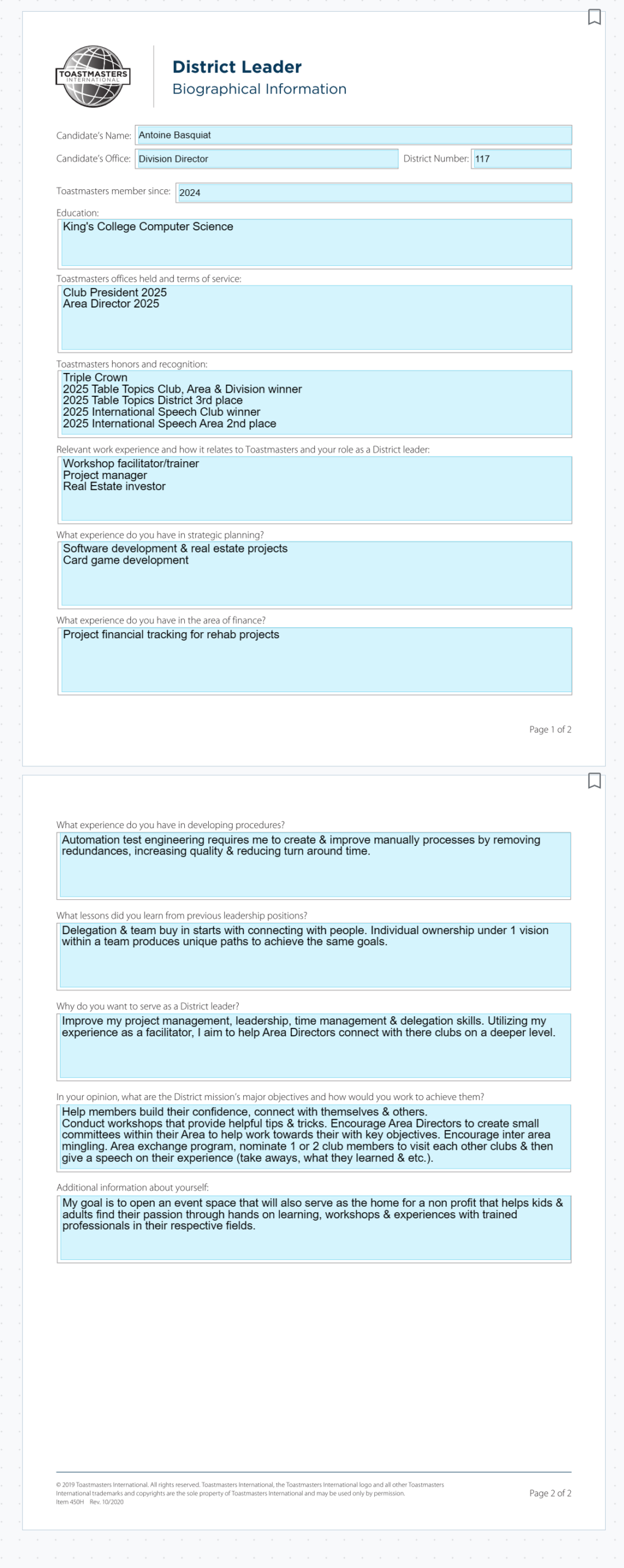 The Incomplete status allows all qualified and eligible floor candidates to run for the Club Growth Director and/or Division Director roles. All floor candidates must declare their intent to run to their District Director and the DLC Chair, plus sign and submit the Officer Agreement and Release Statement, by April 15 (at least 7 days prior to the election on April 22).